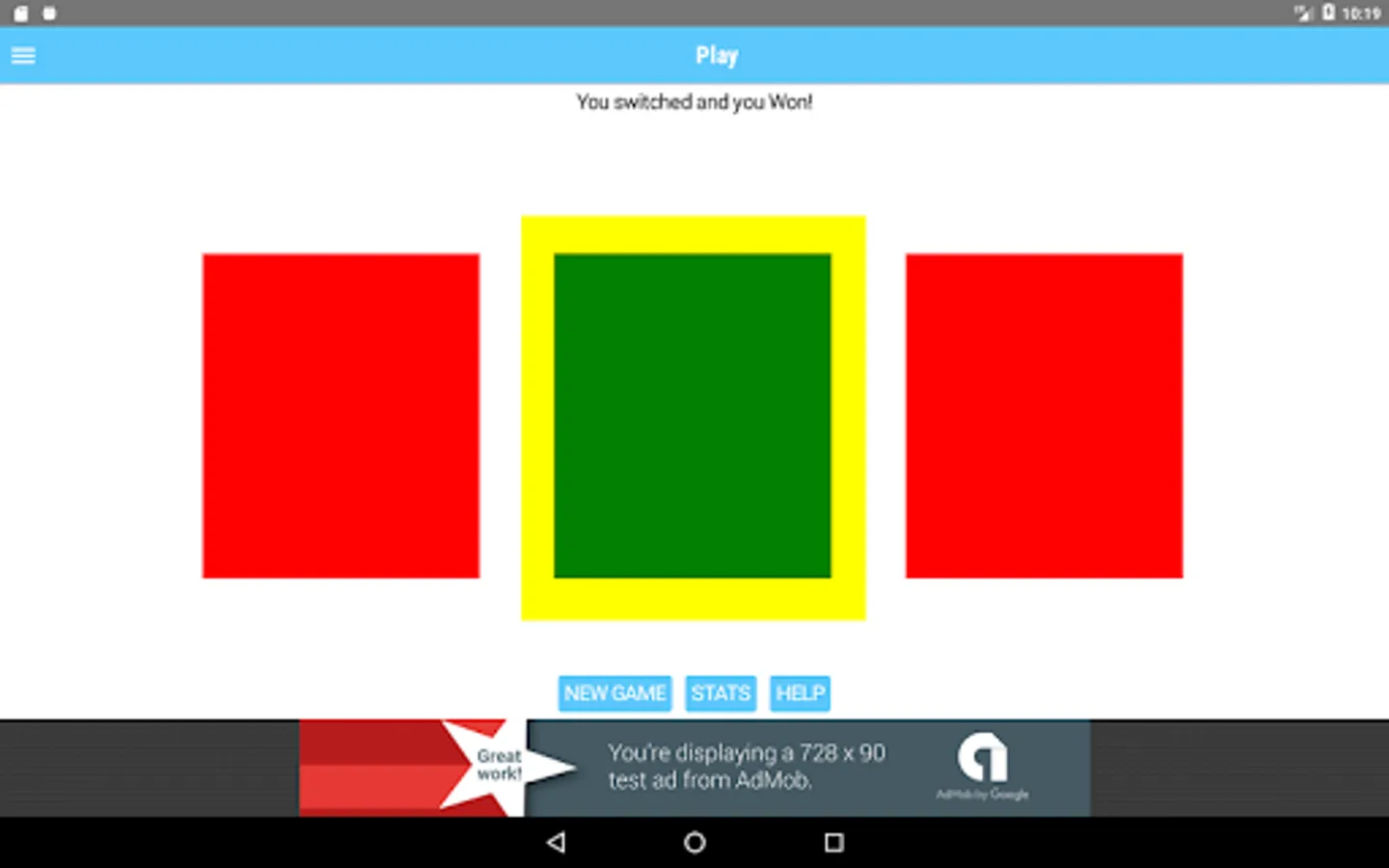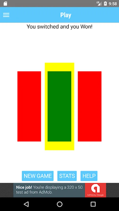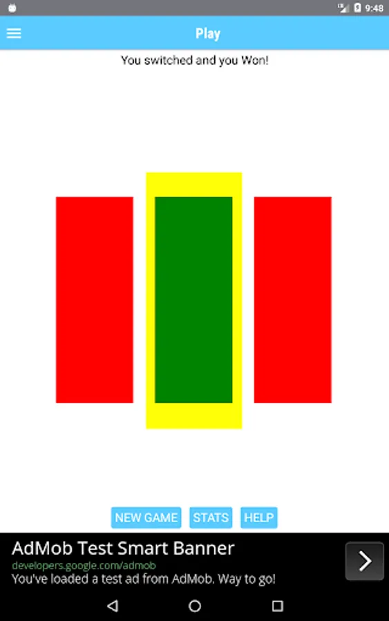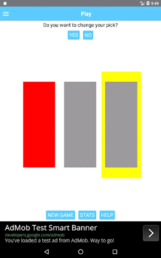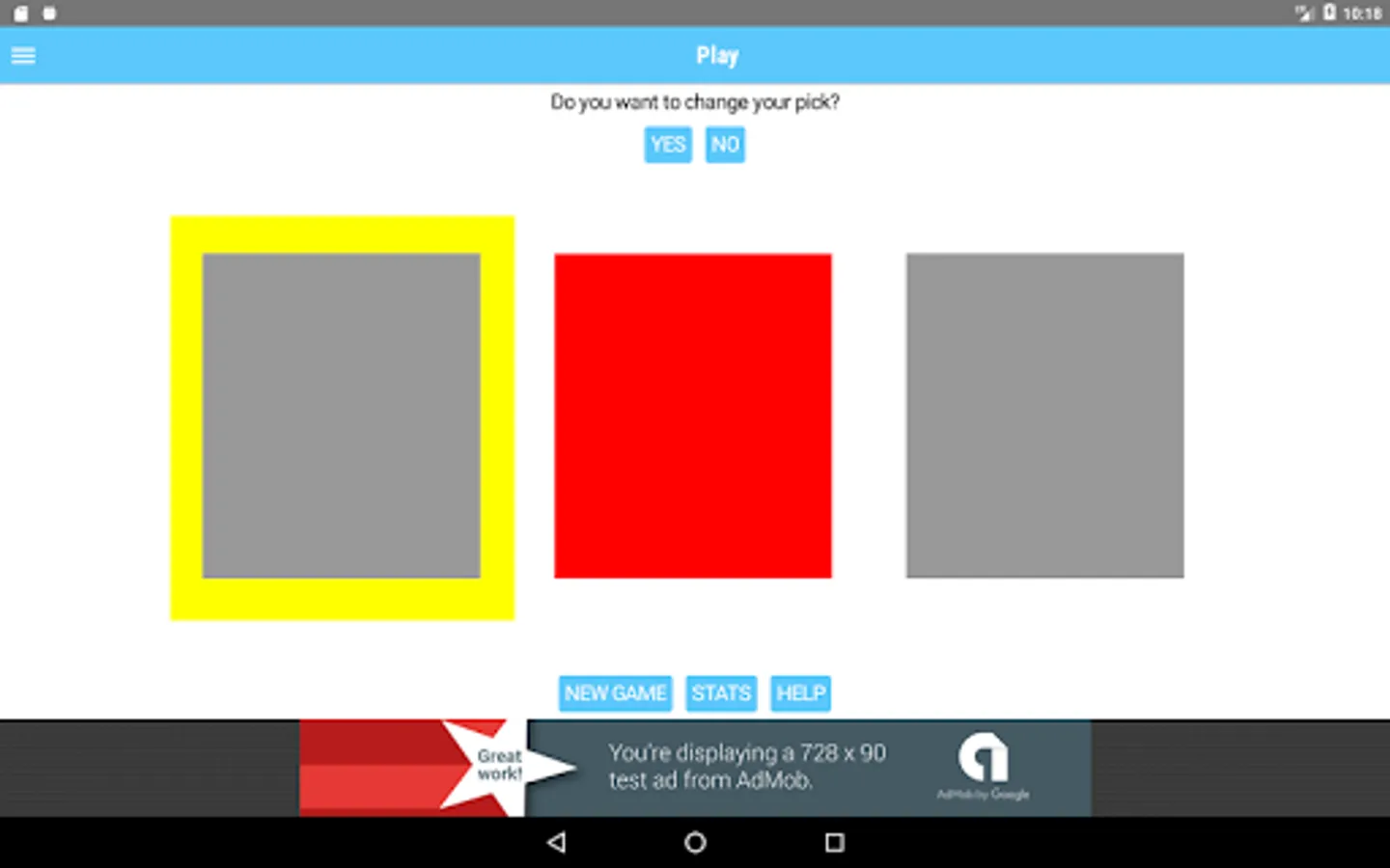 2. A non-selected losing (red) card is turned face up. You now have the option to stick with your initial selection or to switch to the other face down (gray) card.