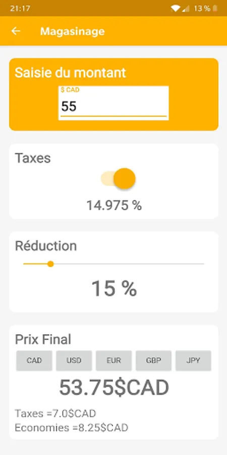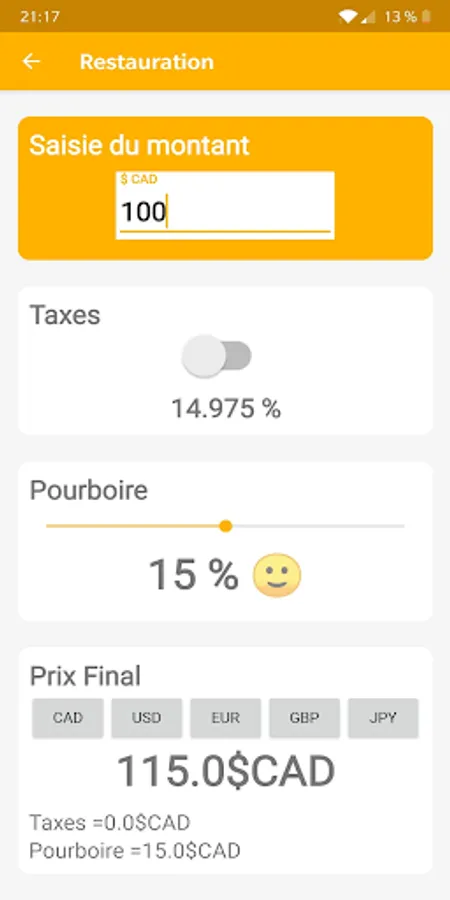 The application allows you to display the result in the currency of your choice (between CAD, USD, EUR, JPY, GBP) and is available in English and French.
