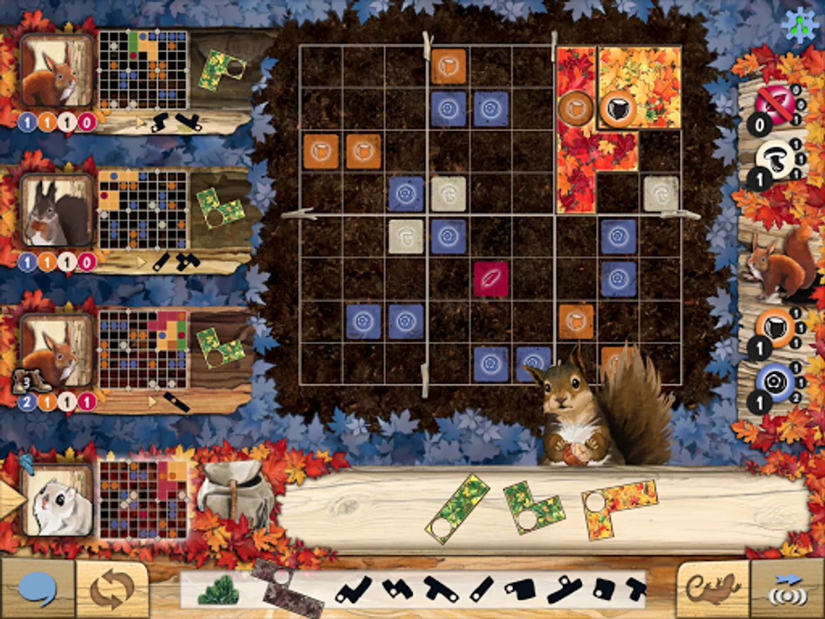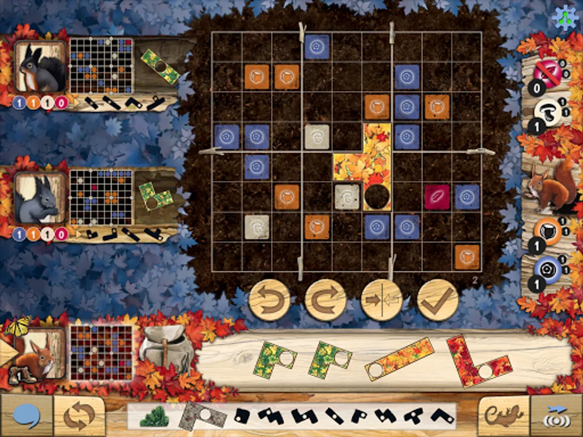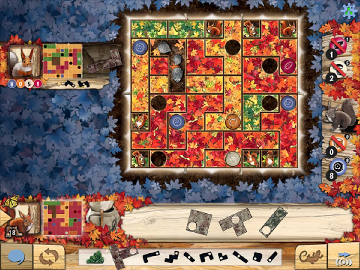 The heart of Indian Summer are puzzle tiles with holes that are placed on individual forest boards to cover up treasures. When players get their hands on these, they gain more options and an edge over their opponents. All that counts in the end is to be the first to cover your forest floor completely with leaves.