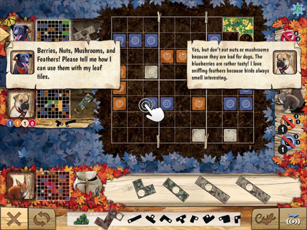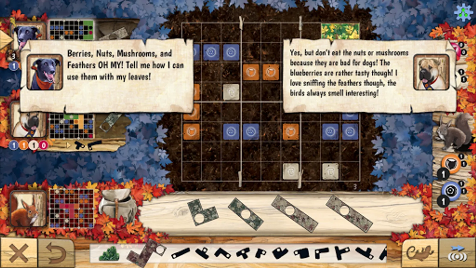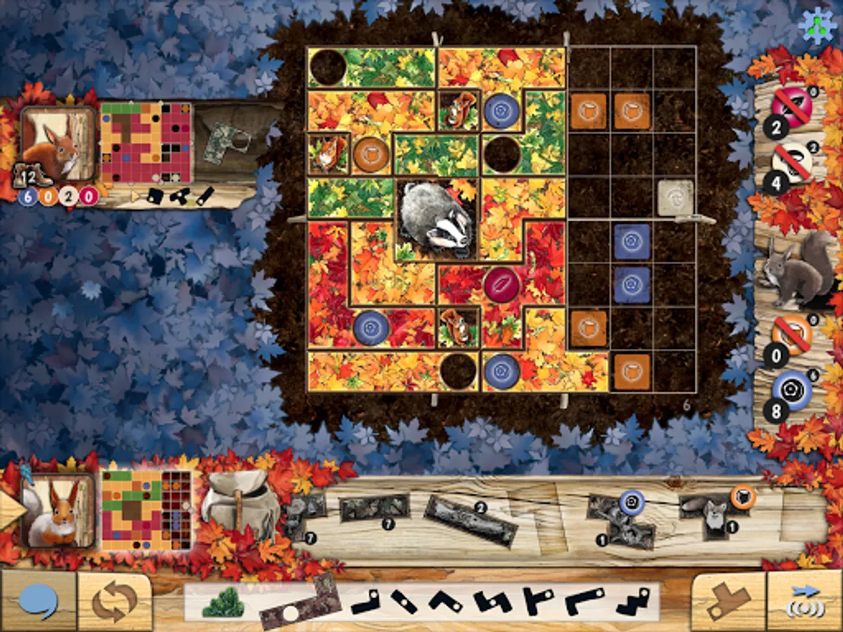 The heart of Indian Summer are puzzle tiles with holes that are placed on individual forest boards to cover up treasures. When players get their hands on these, they gain more options and an edge over their opponents. All that counts in the end is to be the first to cover your forest floor completely with leaves.