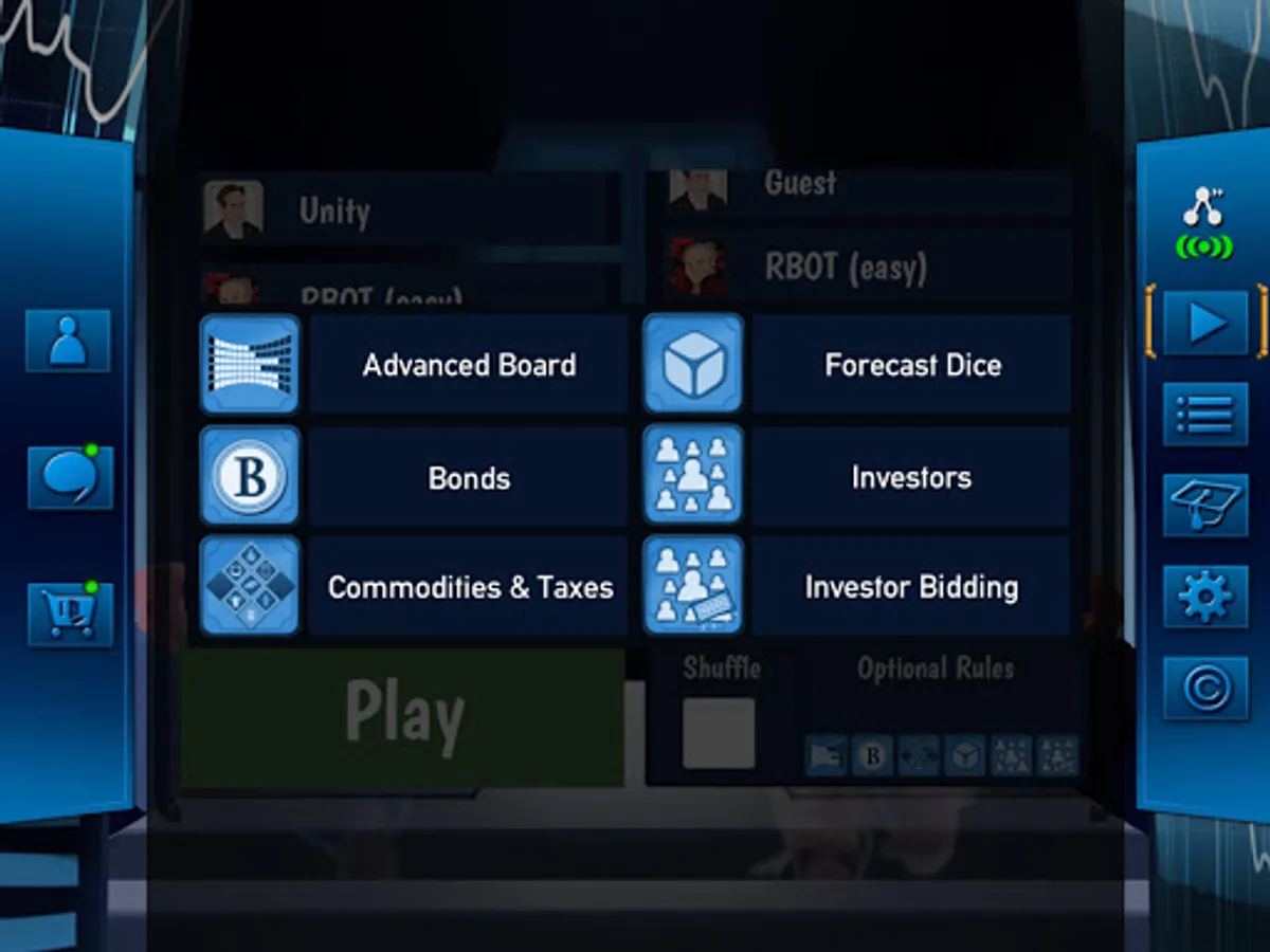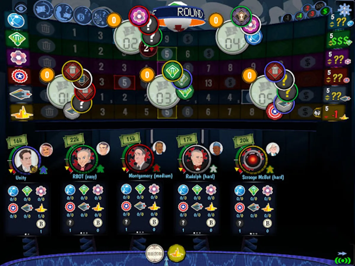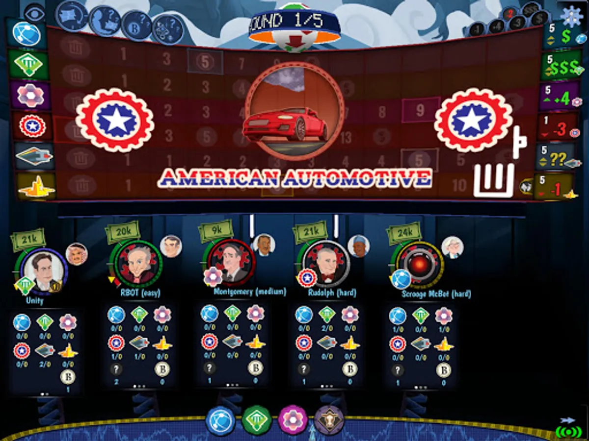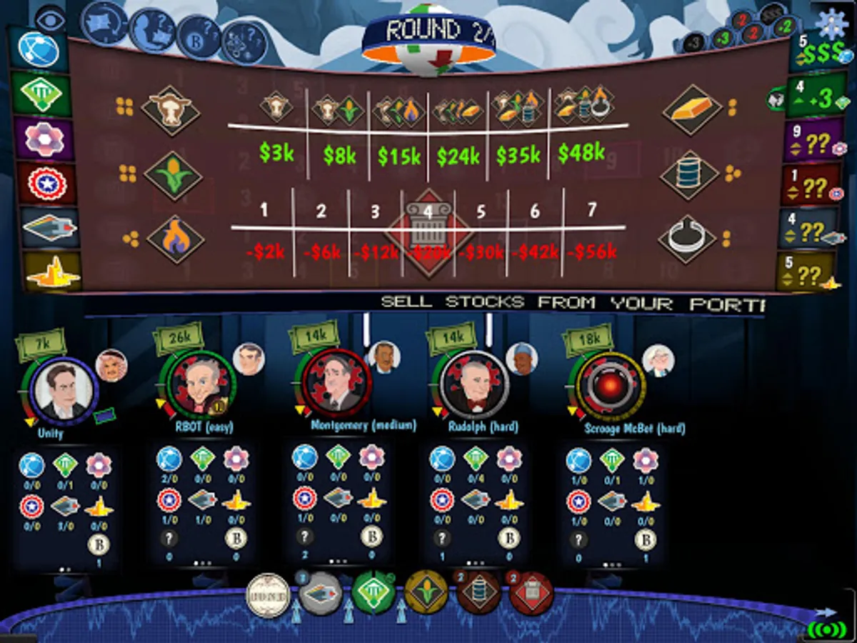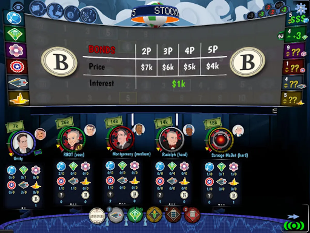 Both of these mechanisms are combined with some stock market elements to make players consider multiple factors when selling a stock. Do you hold onto a stock in hopes of catching a lucrative stock split or do you sell now to avoid the potential company bankruptcy? Can you hold onto your stock until the end of the game to become the majority shareholder, or do you need the liquidity now for future bidding? Do you risk it all by investing heavily into one company, or do you mitigate your risk by diversifying your portfolio?