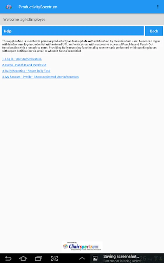 ProductivitySpectrum App is an extension to web based Monitoring portal. It allows to view computer activity of any user configured on web portal. View productivity time of user or captured screen snaps. This application having integration of self-benchmarking and performance analysis, daily reporting and comparison with benchmark with performance.