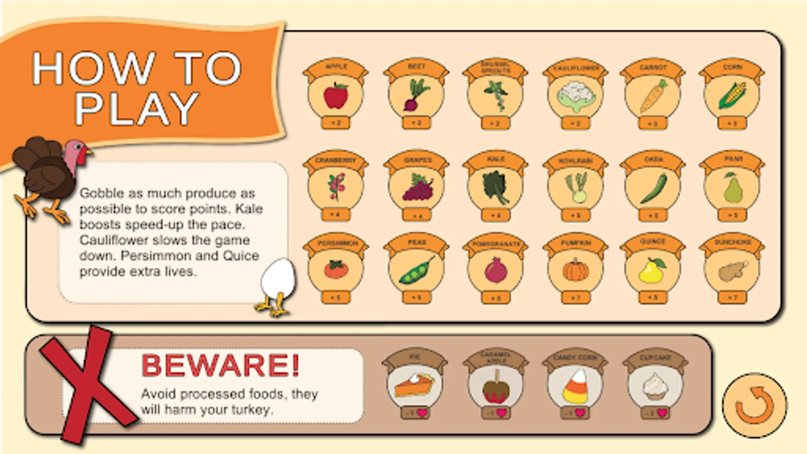 Play as Casual Young Poult or Competitive Tom Turkey to gobble healthy Thanksgiving produce to raise your score. Avoid less healthy food obstacles, they will kill you. Two play modes are available. Casual Young Poult (excellent for practice) and Tom Turkey Global Races. Only Tom Turkey mode records to the leaderboards.