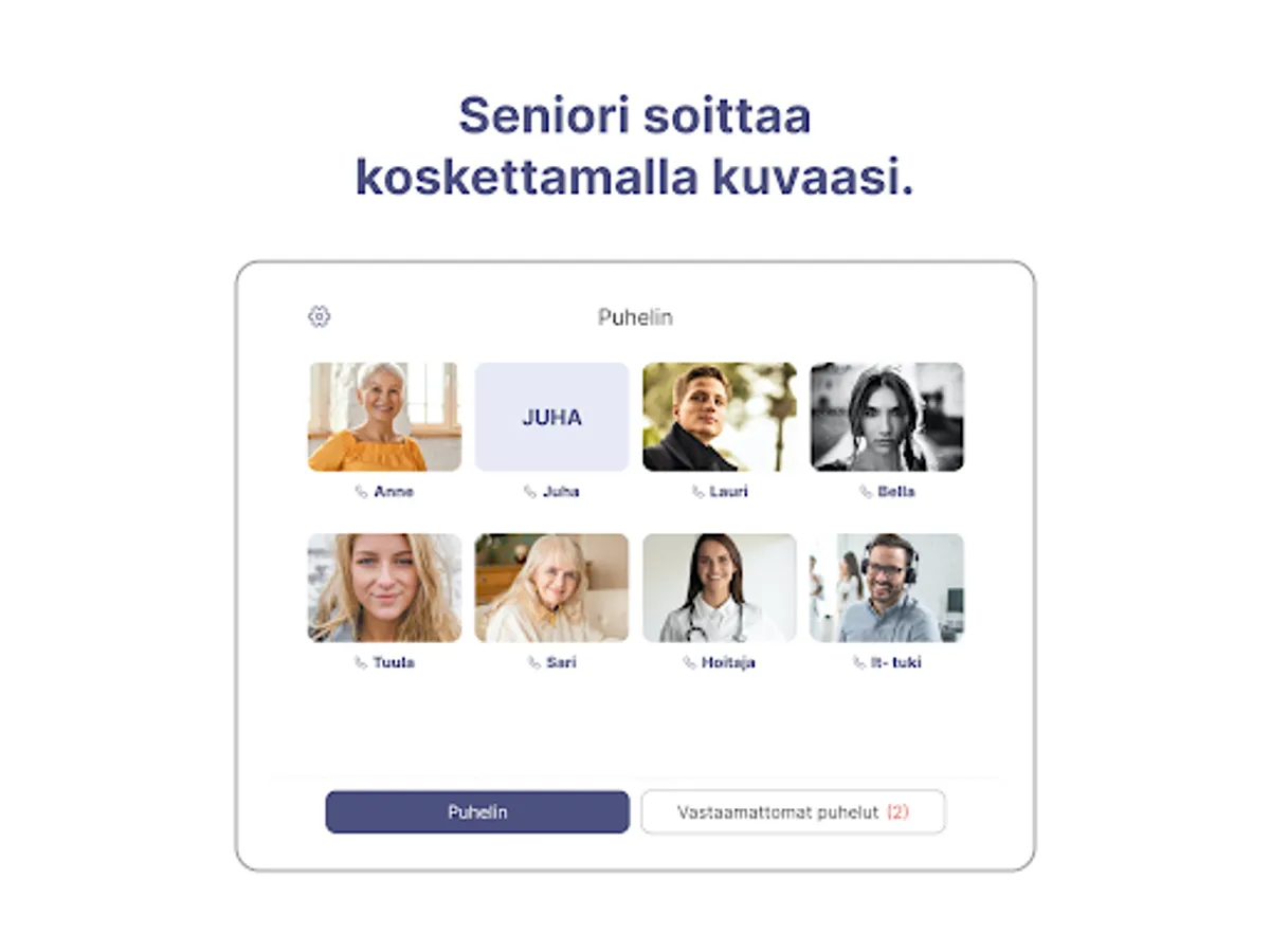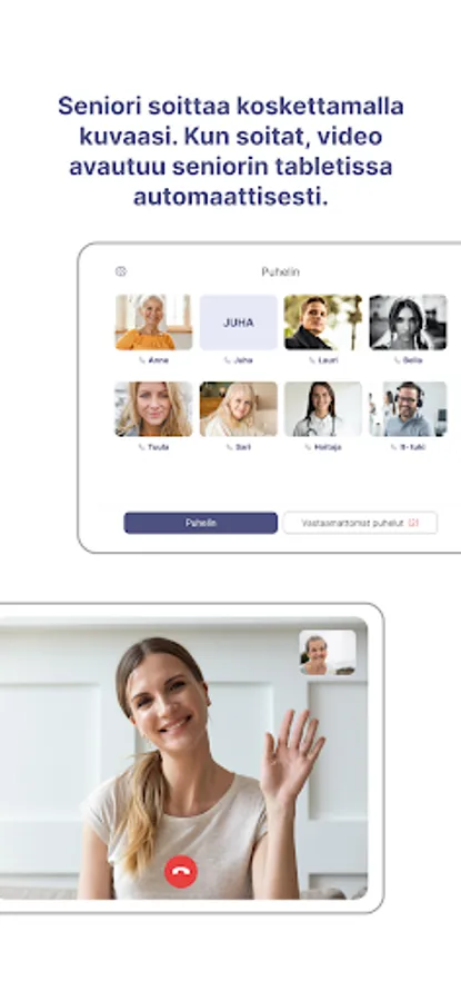 The Digihappy video app brings the family together. When you call the Digihappy senior tablet, the video opens for the senior without touching. You can always catch the senior and you can make sure that everything is fine. You can talk about what's going on, and the senior can join in your family's shared moments with the help of a video image. A senior can easily call you by touching your picture or name. The Digihappy application can be used with Digihappy credentials. Read more about the Digihappy Senior Tablet service at www.digihappy.fi.