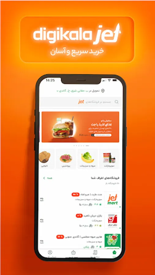 "Digikala Jet" is an online platform that provides a quick and easy online shopping experience from nearby stores. The application started its activity by only focusing on the online supermarket line, and now it has added various new categories such as bakery, fruit, and vegetables, cafe and restaurant, protein shops, beauty and health, pet shop, etc.