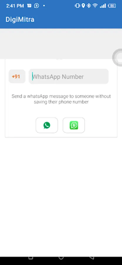 Use Digimitra App to Send Whatsapp Message to any number without saving them in phone book contact. The App Works seamlessly with whatsapp regular and whatsapp business. It gives you option to choose between whatsapp regular and whatsapp business, for sending a message to unsaved number.