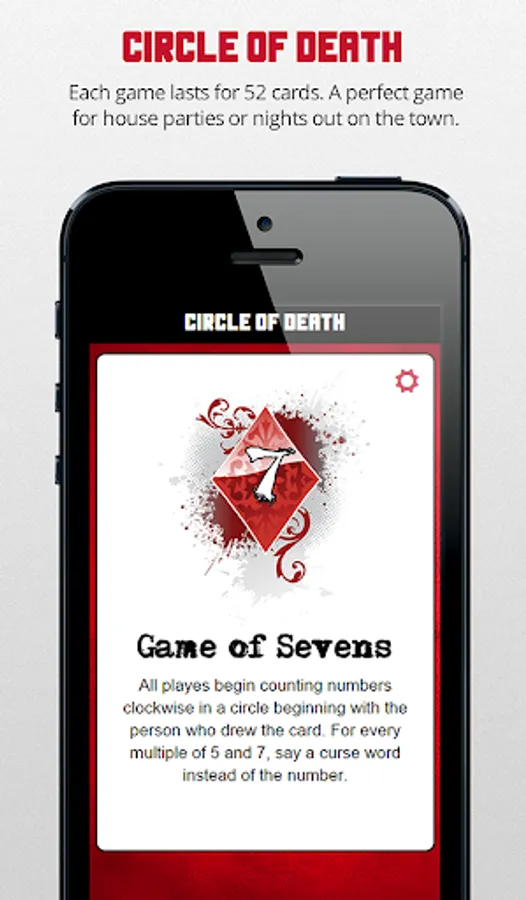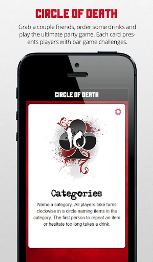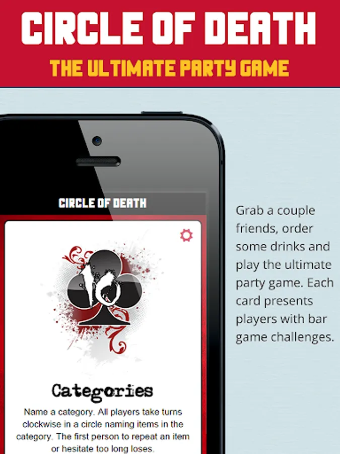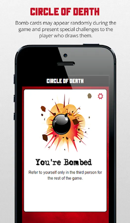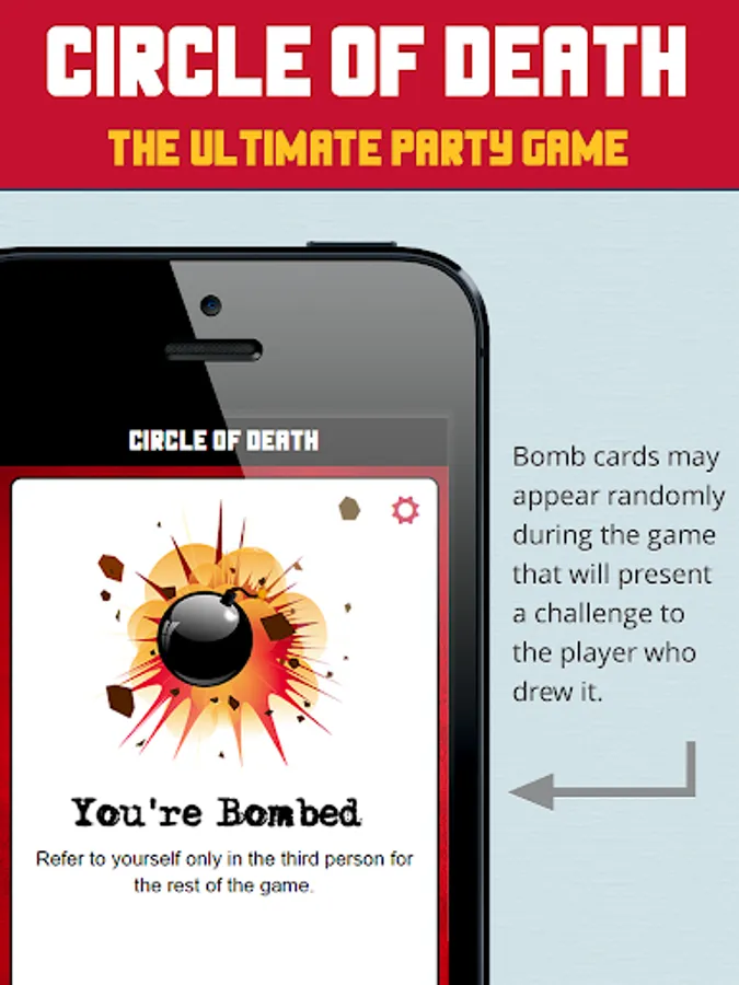 The game is comprised of 52 standard game cards with several bonus cards added such as bomb cards that dare the person who drew it to a ridiculous challenge for the rest of the game such as pin your elbows to your sides and drink like a t-rex for the rest of the game. Circle of Death buddy cards link two players together for the rest of the game so that whenever one drinks, so does the other.