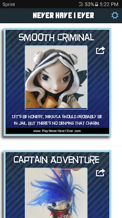 Awards given are based on which the topics of Never Have I Ever statements players have done, such as dangerous actions, adventurous stories, an embarrassing history, sexual conquests, lucky opportunities and more!