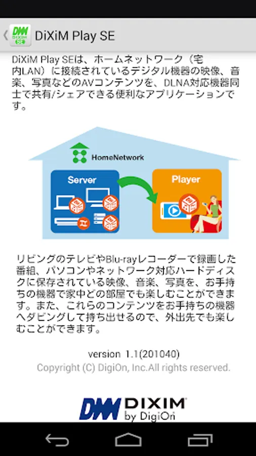 DiXiM Play SE can enjoy the digital broadcast recorded content stored on the server device that supports DLPA2.0 remote access guidelines as well as the home of the home network, to play over the Internet from outside the home, remote viewing is enabled network players.