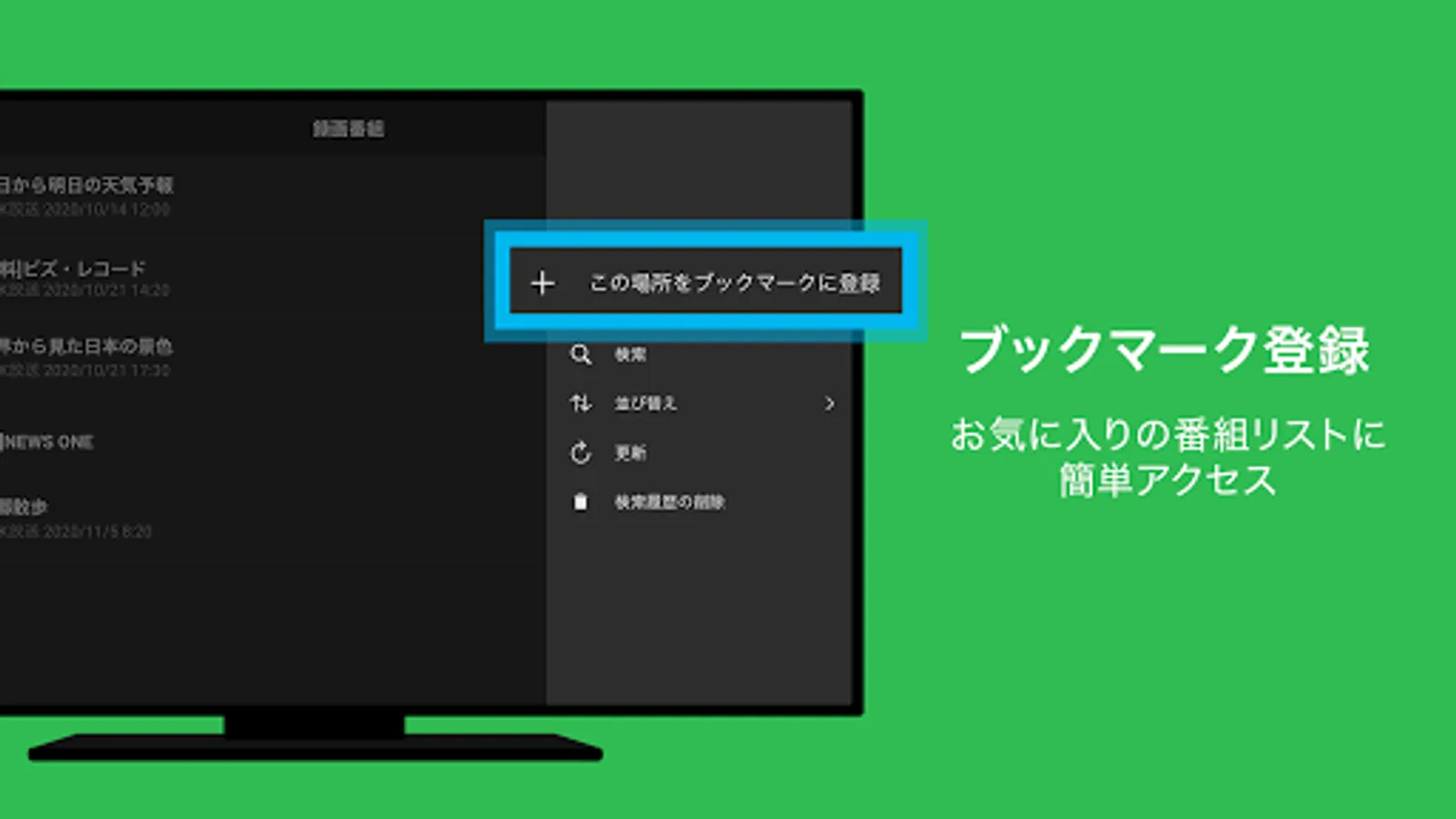 With Android TV, you can enjoy programs recorded on a TV or recorder, programs being broadcast, videos, music, and photos stored on a network-compatible hard disk in any room in your home.