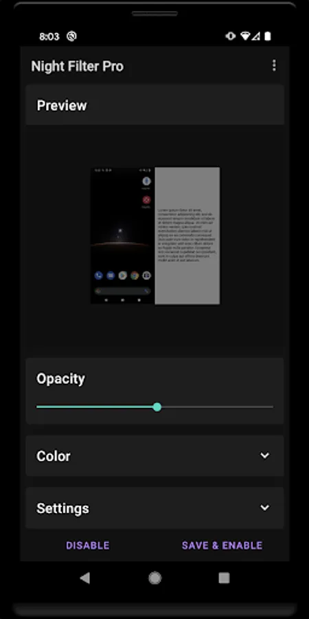 Night Filter is an easy to use screen filter app for your Android phone or tablet. Night Filter makes it easy for you to dim your screen, adjust your color tint and filter blue light, and more! Use it to read at night with less eye strain and correct for an excessive screen tint.