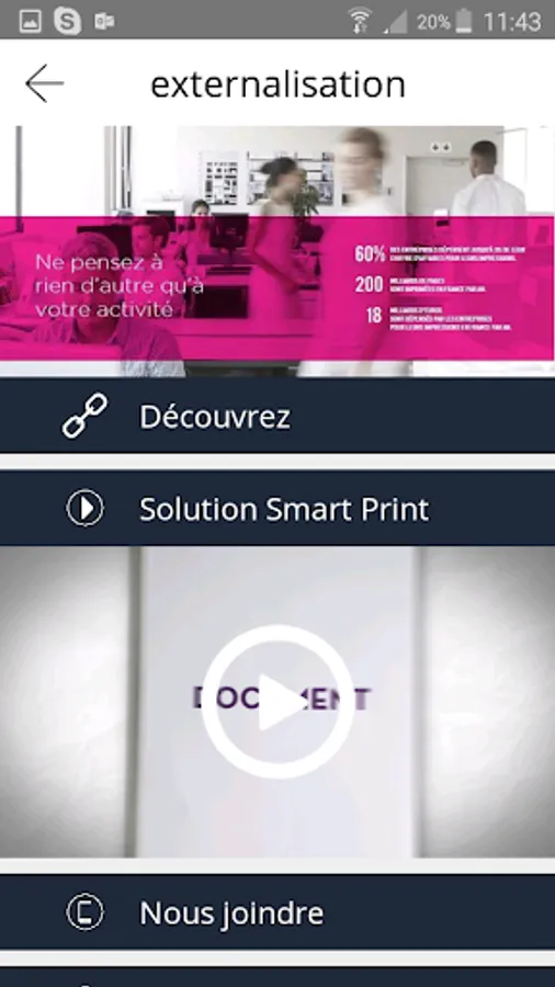 By simply scanning your document printed from the application, discover enriching multimedia in your document. The Digiprint application opens you an infinite scope: web link, PDF, geolocation, video, phone, sms, email, calendar, form, vcard, sharing.