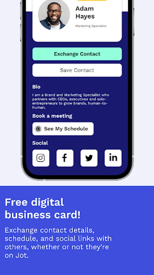 Digital Business Card: exchange contact details using your QR code, even if your contact doesn’t have the app or find each other on Jot™ using your unique JotID™.