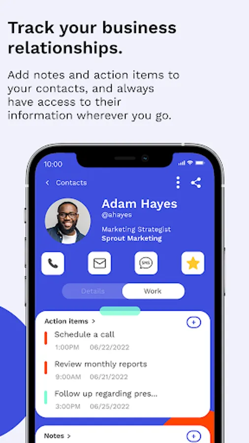 Action Items: Track your tasks and manage your to-dos by adding action items directly within a contact’s profile. Stay organized and always remember to follow up with your connections.