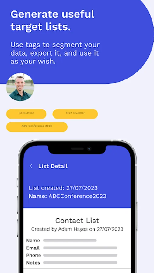 Tags, Reports, and CSV Export: Create custom tags to help group and segment your contacts into lists that can be exported to PDF or CSV and shared with your team.