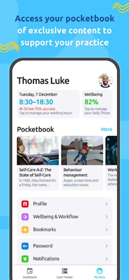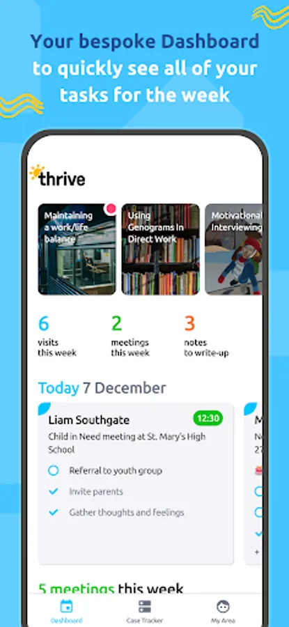 Built by social workers for children’s social workers in the UK, thrive leverages the following four key features aimed at empowering social workers to do their best work while protecting them from burnout by allowing them to see symptoms early before it is too late: