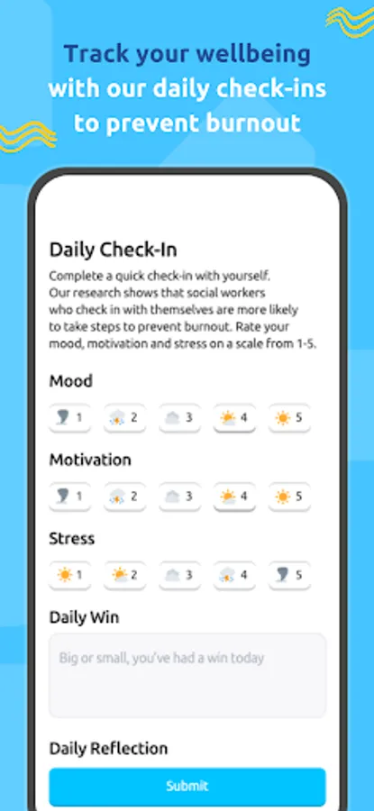 Daily check-ins to remind you to look after your own needs. Track your stress, mood, motivation and more. Catch signs of burnout early so you can get support as soon as possible.