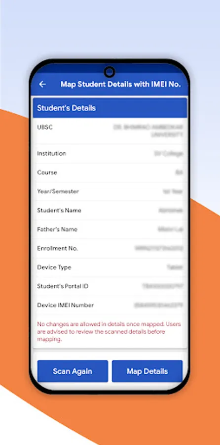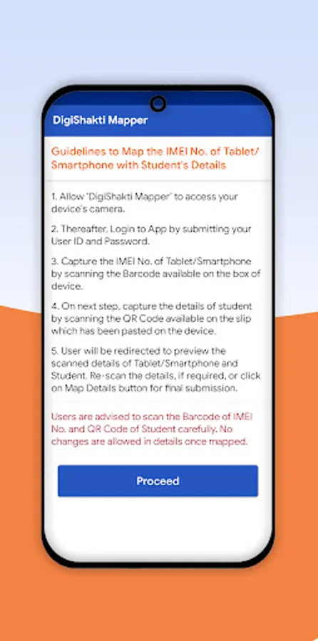 To map the details, Institutions will have to login to the App and Scan the Barcode of device box which includes IMEI No. of device and thereafter scan the QR Code of Students’ Slip pasted on device by the Institutions.