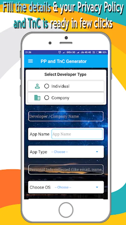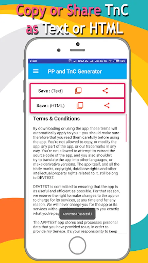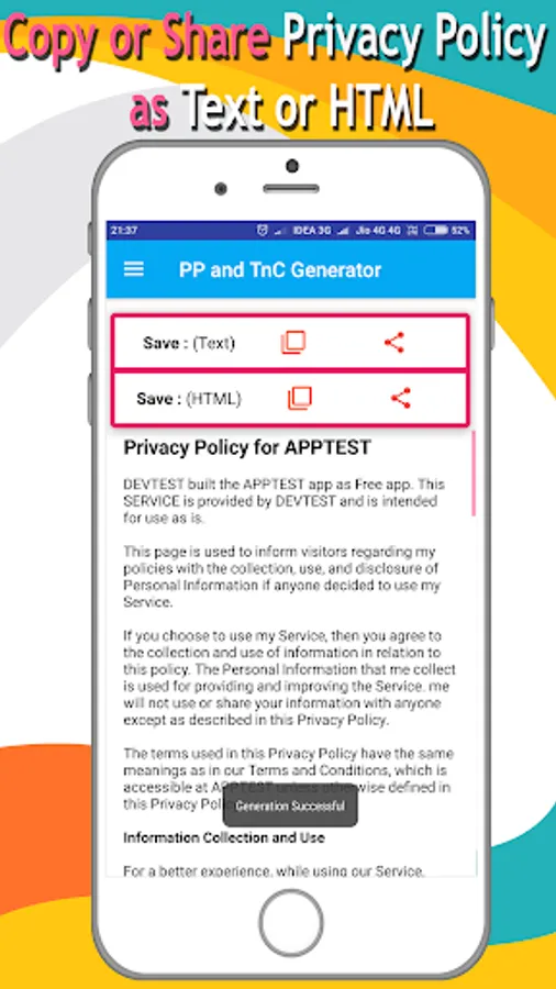It is easy to generate Privacy Policy for your app or terms and conditions for your app from this app privacy policy generator. Just fill the few details in app and click on GENERATE button. That's it... Done