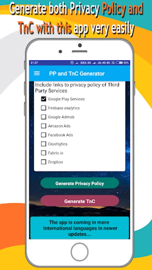 ✪ We will be coming with more features in future updates... mainly the generation of Privacy Policy and Terms and Conditions in more than one languages