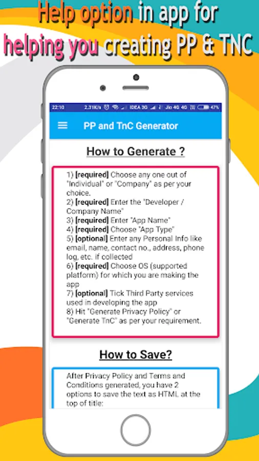 * Inbuilt help guide to help you generate your Terms and Conditions for apps and acts as app privacy policy generator too