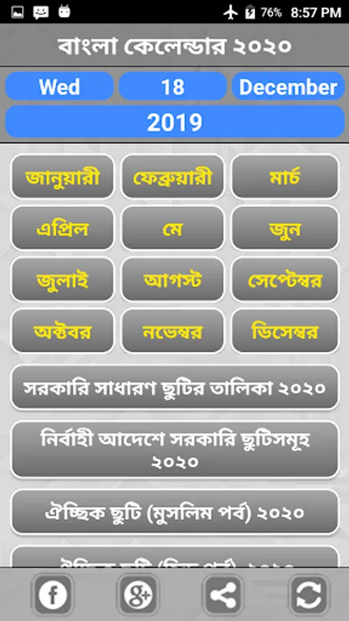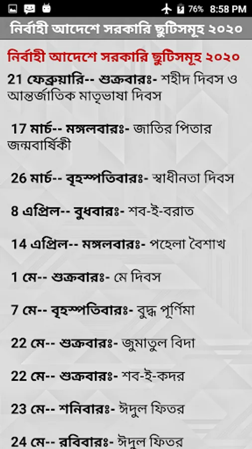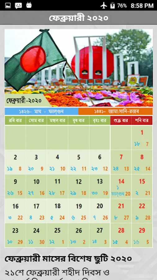 BD Govt Public holiday calendar of 2020(Chutir Talika - 2020). We tried to create best Bengali Holiday Calendar 2019 where you will get the list of all govt holidays list (Bangla-Chutir Talika). This calendar includes holiday schedule of primary school, bank, high school and college. Location wise Ramadan Schedule. Again, the festival holiday is also included with short descriptions. Holidays information is taken from Bangladesh Government Holiday gadget. It supports both Bangla calendar and English Calendar. You can see the details by tapping on holidays.