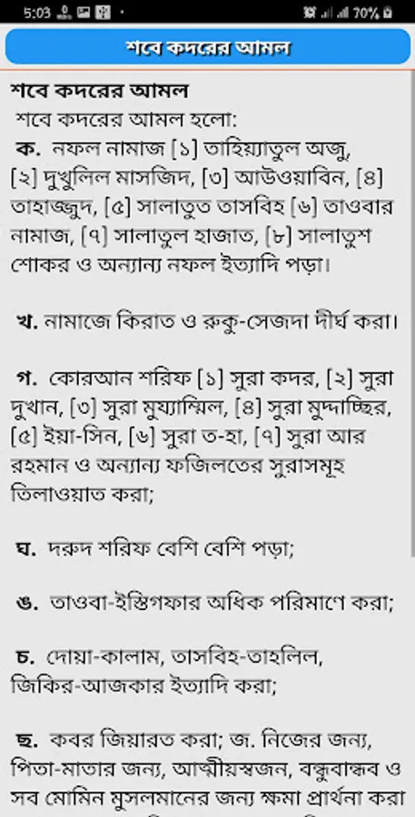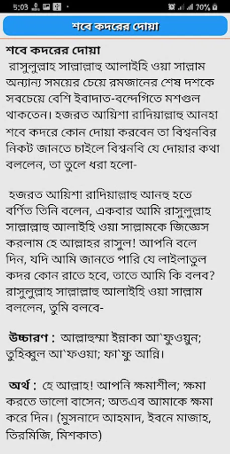 লাইলাতুল কদর কি বা শবে কদরের অর্থ কি তা এই অ্যাপের মাধ্যমে যানতে পারবেন। আরও জানতে পারবেন শবে কদরের ফজিলত এবং লাইলাতুল কদর এর রাতে রমজানের উপহার কি কি। শবে কদর অথবা লাইলাতুল কদর রমজানের শেষ দশ দিনের বেজুর রাতে হয়ে থাকে যা হাজার মাসের চেয়েও সেরা একটি রাত। একজন মুসলমানের এ রাতে করনীয় কি তা খুব ভালোভাবে জানতে পারবেন এই অ্যাপটির মাধ্যমে। শবে কদরের নামাজের নিয়ম এক জন মুসলিমের জানাটা যেমন জরুরী তেমন শবে কদর বা লাইলাতুল কদর কখন হবে সেটা জানাও দরকার। ইতিকাফ রনজানের আরেকটি ইবাদত। শবে কদরে কি কি ইবাদত করবেন তা আমরা এই এ্যাপের মধ্যদিয়ে জানাবো এবং আরও জানবেন শবে কদরের তাৎপর্য।