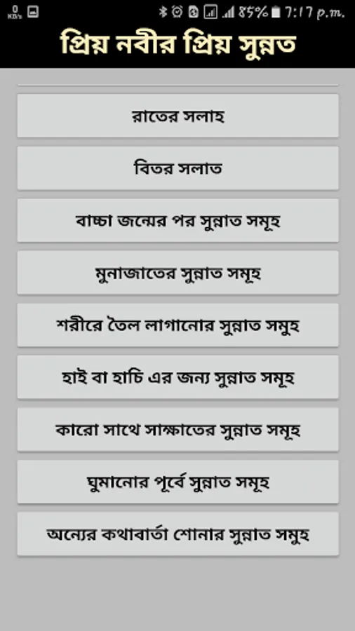 এই অ্যাপের মাধ্যমে আপনি সকালে ঘুম থেকে উঠা থেকে রাতে ঘুমানো পর্যন্ত সকল সুন্নত আদায়ের সহী নিয়মাবলী জানতে পারবেন। একজন মুসলমান ২৪ঘন্টা সুন্নাত/ sunnat আদায়ের নিয়ম জানতে পারবে।