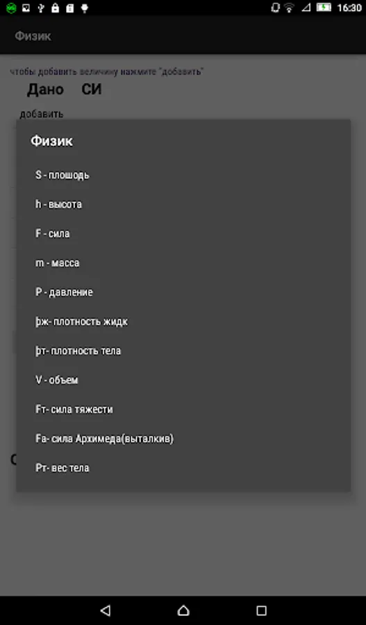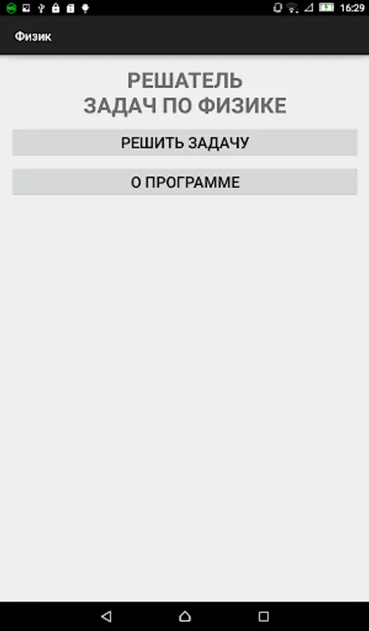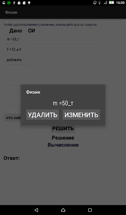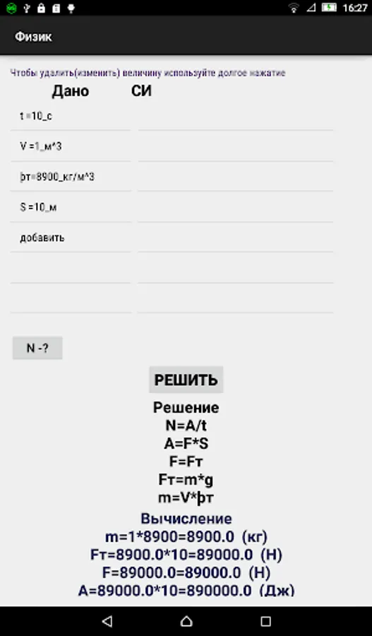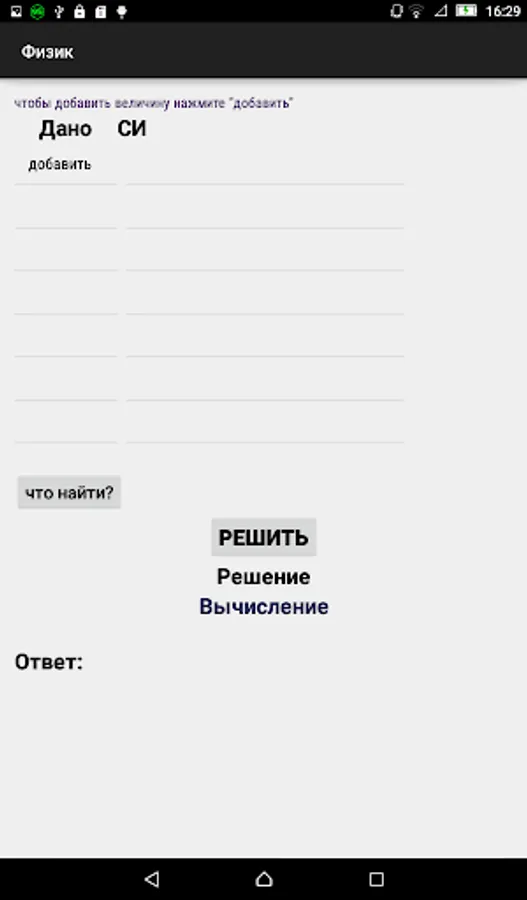 This application is designed to solve problems in physics for the 7th grade school course. A key feature of the application is the presentation of the solution in a standard form (translation into the SI system, derivation of the solution formula and their numerical value).