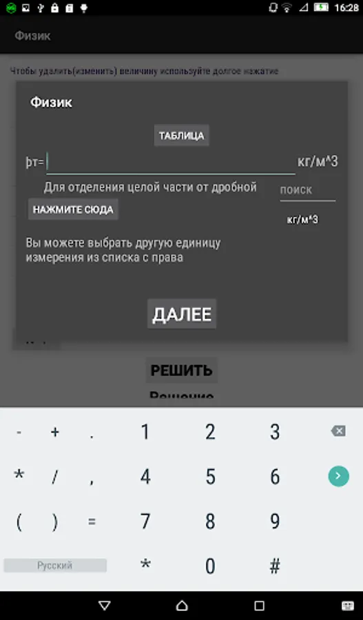The application uses a convenient interface for entering the desired and data values. And also it is possible to select from the table the values of physical quantities for which the tables are compiled.