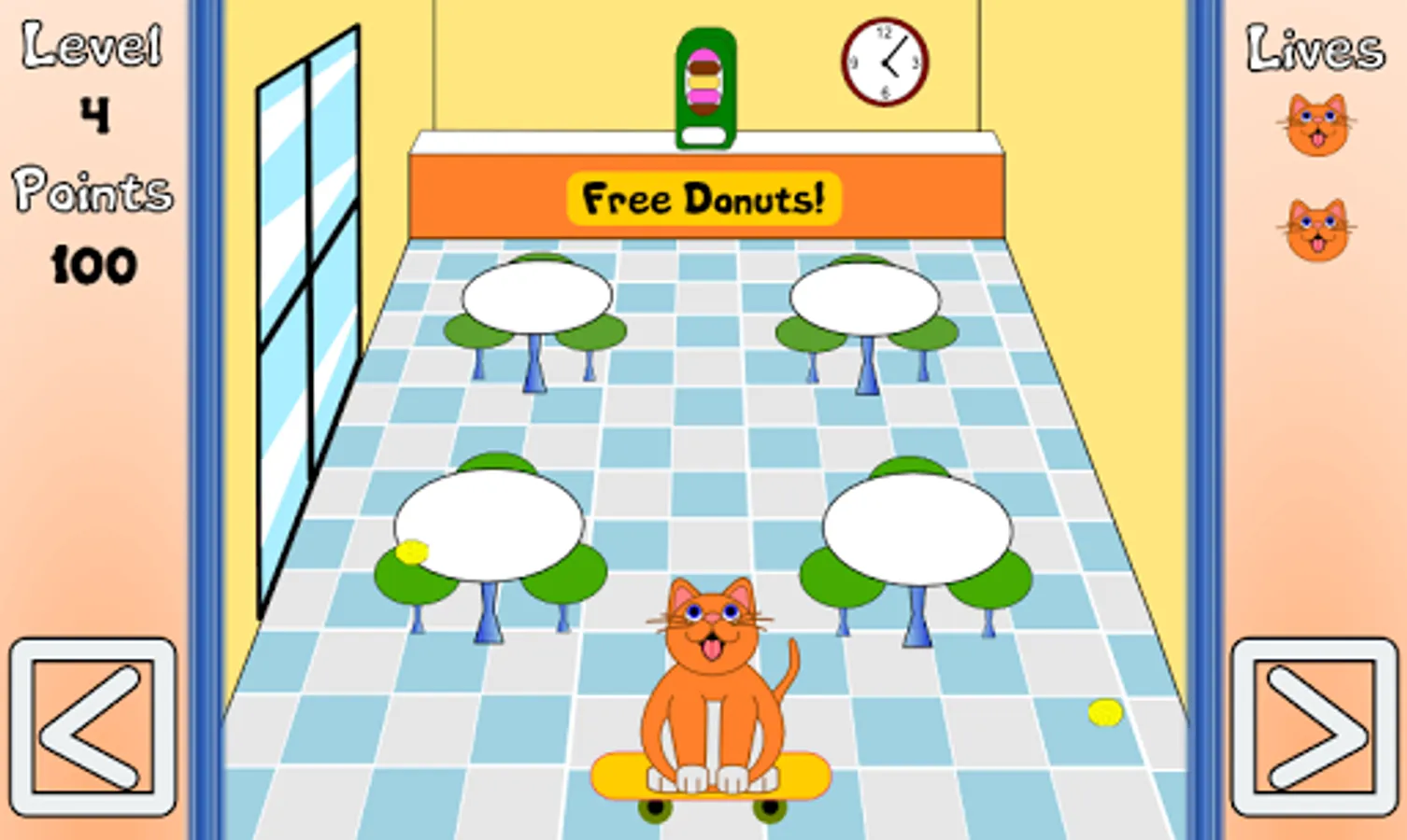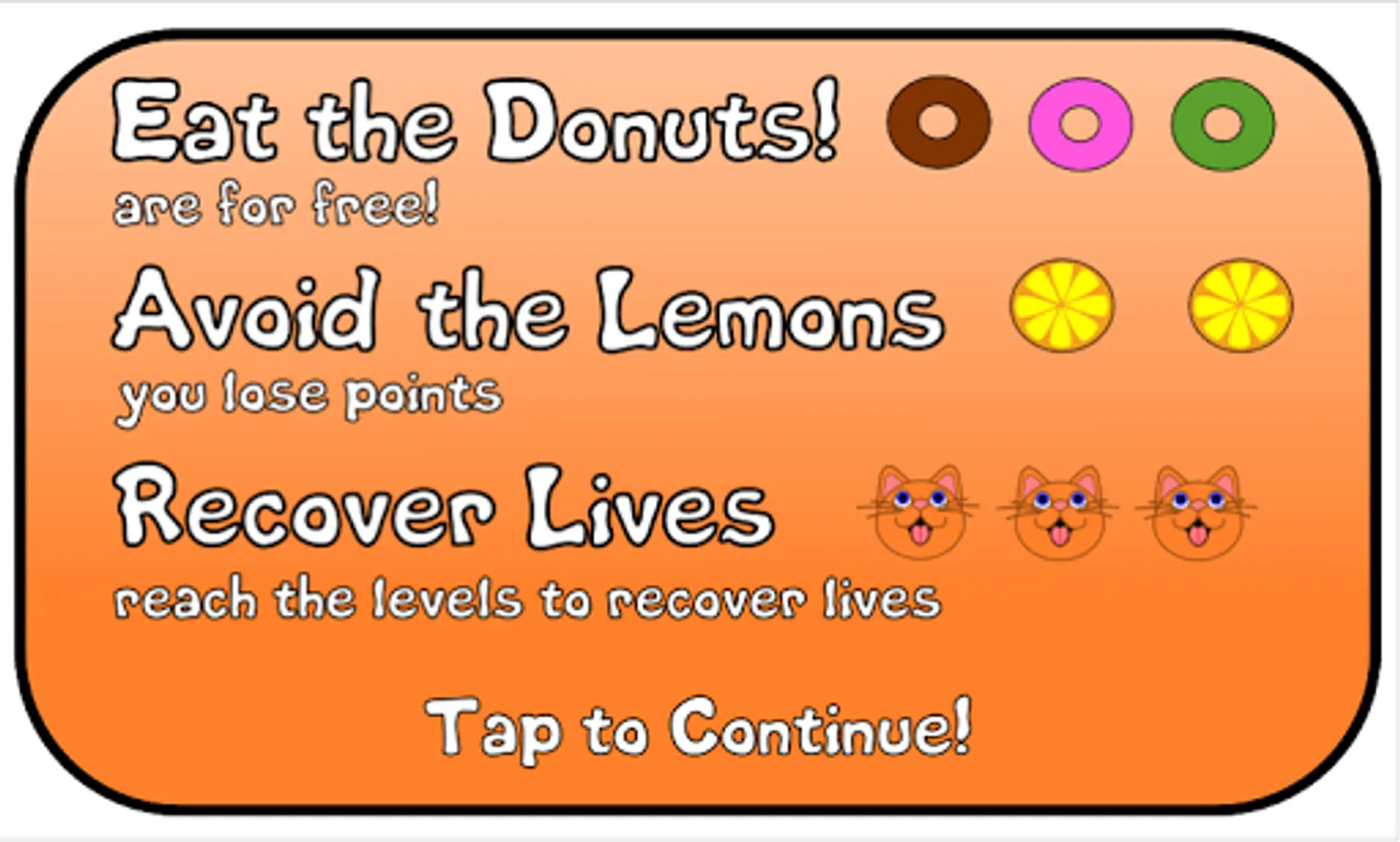 Play with the cat. Eat the donuts to get points. Careful! each level is faster!. Level 5 is madness! Avoid the lemons, if you eat lemons you will lose points.
