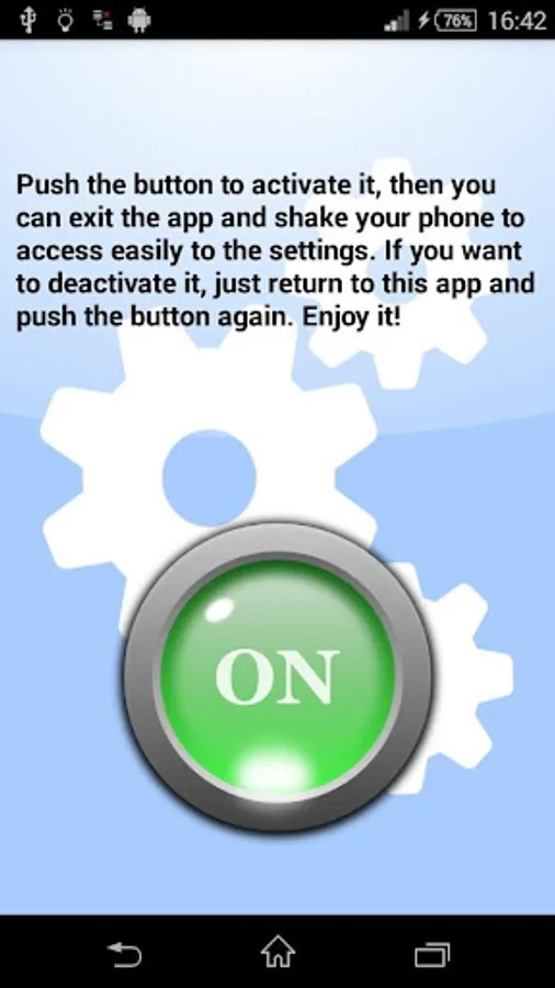 Forget the apps with complicated options, just touching one button you can activate it. Then you can close the app and use your mobile as usual. When you need to use your phone settings just shake your mobile and you have it!