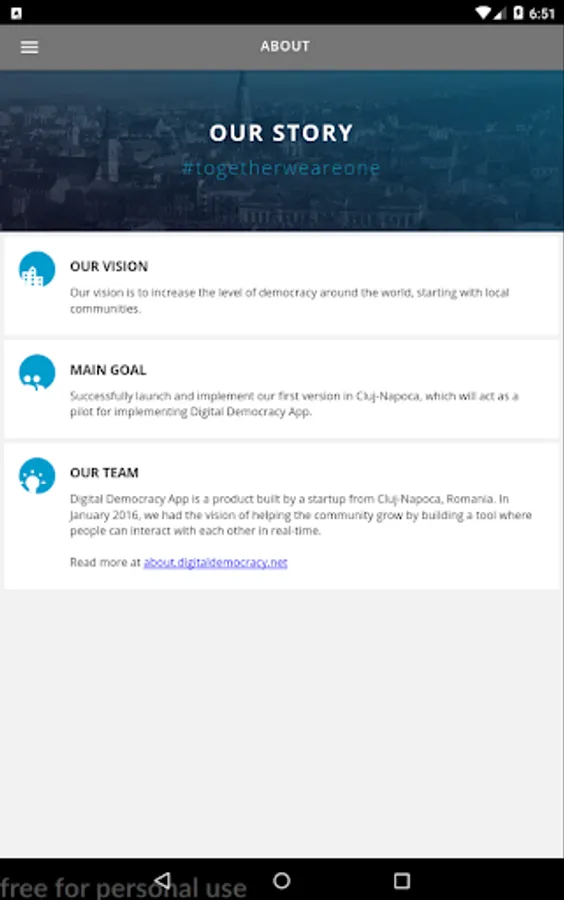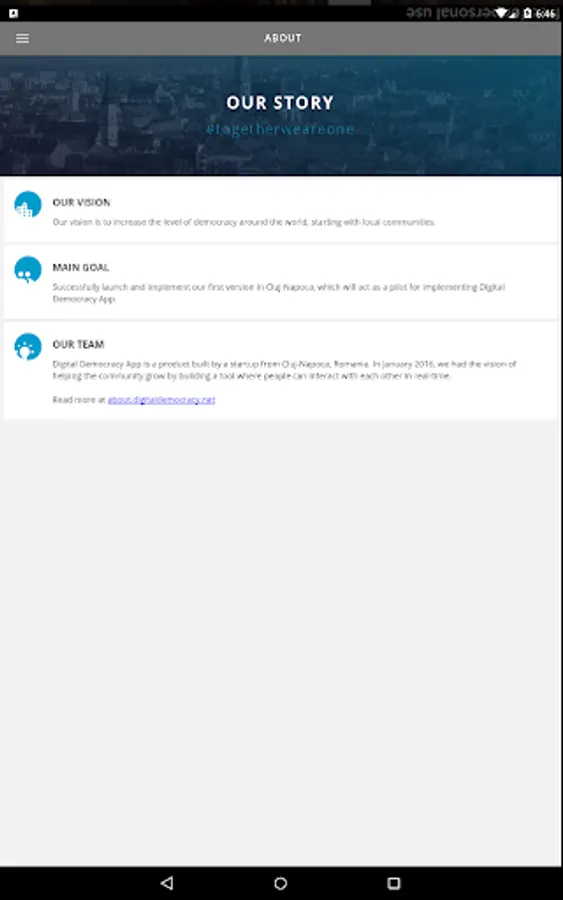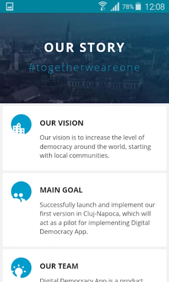 Digital Democracy is the first app. designed to digitize democracy. Born and launched for the first time in Cluj-Napoca, Digital Democracy changes the way we experience democracy and build our civil participation.