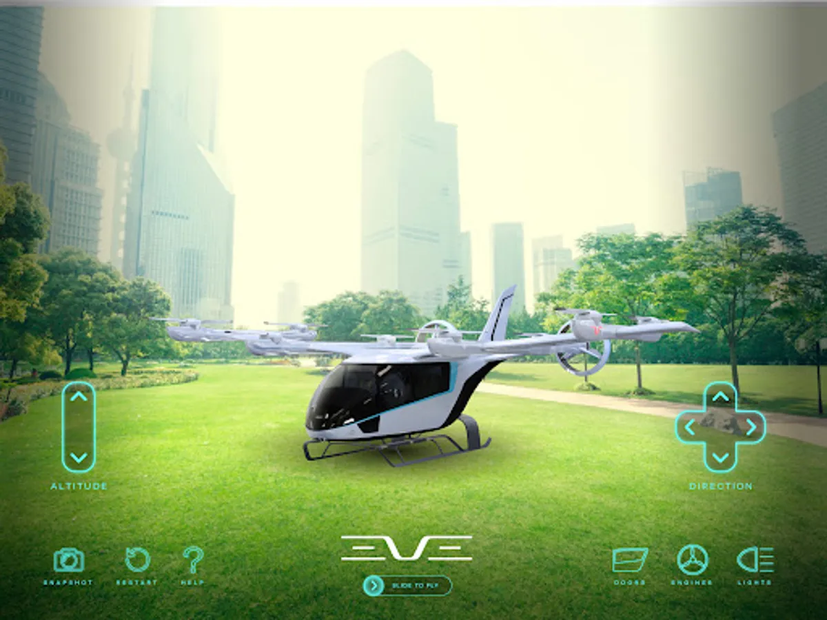 Using this augmented reality app, you can see Eve’s eVTOL at 360°, walk around, zoom in to check its interior design, and pilot it wherever you are.