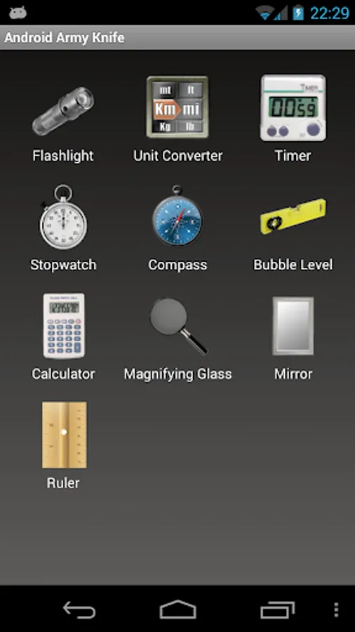 This app contains a set of tiny tools: a unit converter, a compass (magnetometer required), a bubble level, a calculator, a stop watch, a timer, a magnifying glass, a mirror (front camera required), a ruler and a flashlight (app and widget).