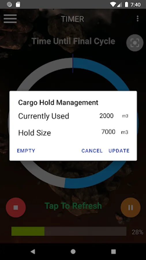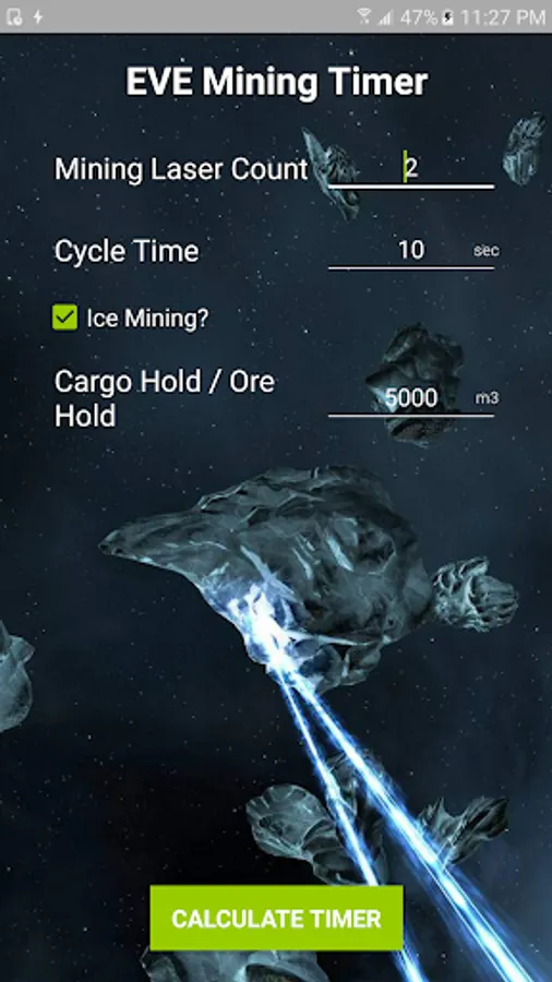Are you an amazing mining multi-tasker? I really wanted to be, but I kept finding my Cargo Hold full and the mining lasers off, so I created this app. It takes all of the guess work out of timing when to look at the screen and empty your ore (or ice).