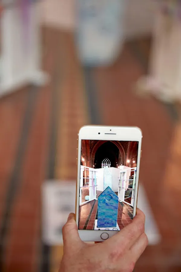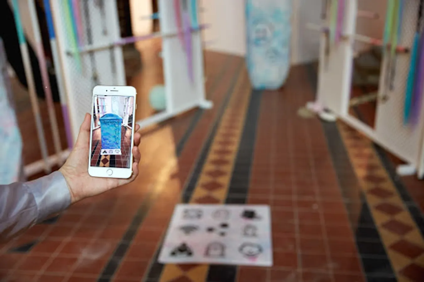Step 2: Open the app and point your smart device towards the floor-targets fabricated by the artists in the exhibition. It will immediately trigger the AR experience.