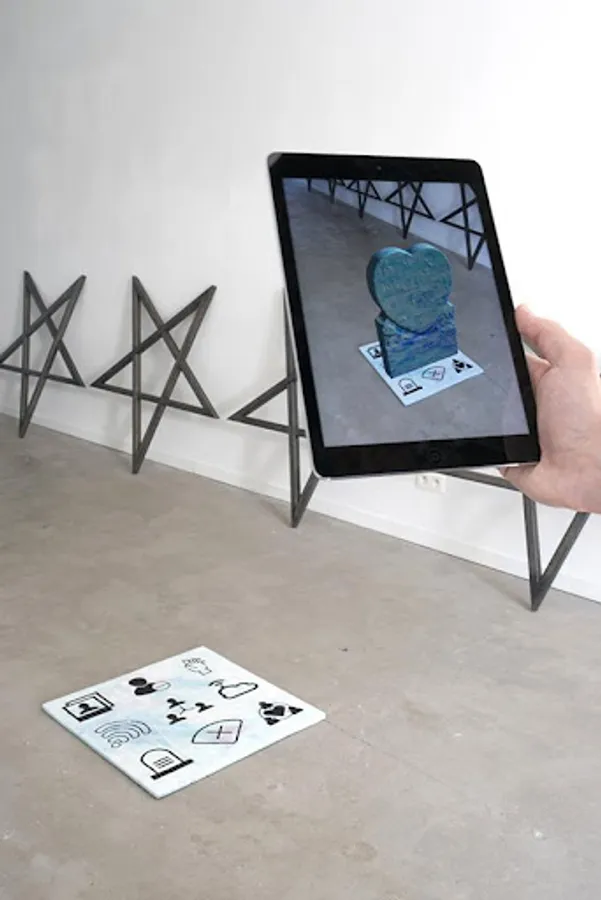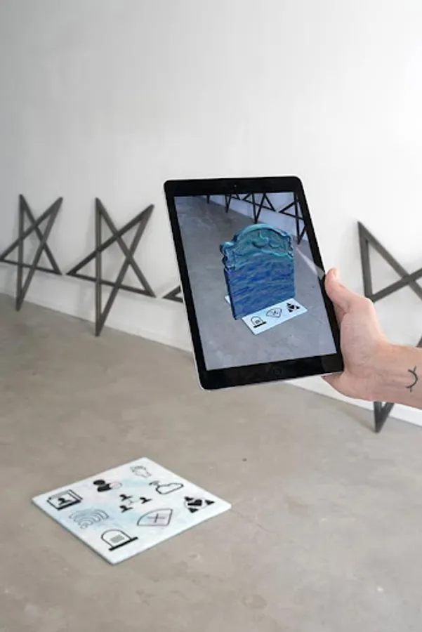 The app interacts with a series of international exhibitions by artists Rachel McRae and Sarah Derat. For each show, the artists provide one or several AR target(s)/marker(s) in the exhibition space and a QR code to swiftly download the app.