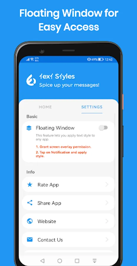 But wait, there's more! Text Styles isn't just about aesthetics, it's about convenience too. Our app seamlessly integrates with your favorite messaging platforms, making it effortless to add that extra spark to your conversations. No more switching between apps or struggling with complicated settings – we've made it simple, so you can focus on what truly matters: expressing yourself with style.