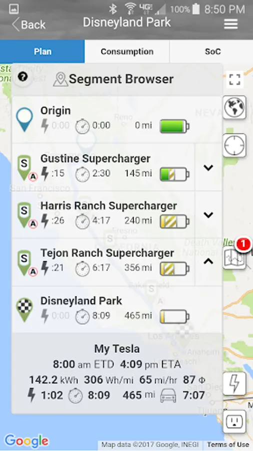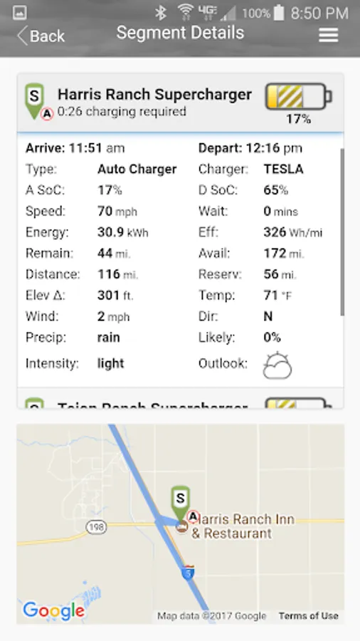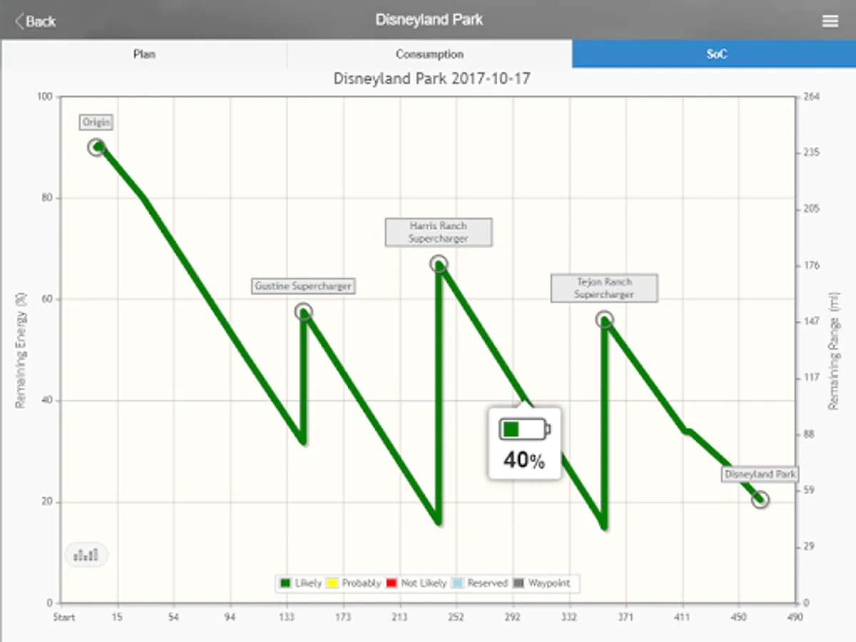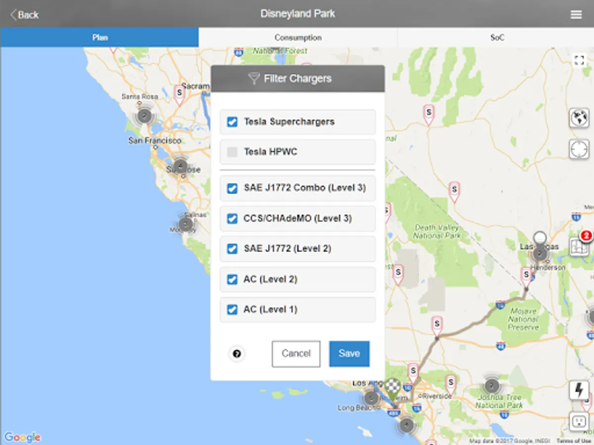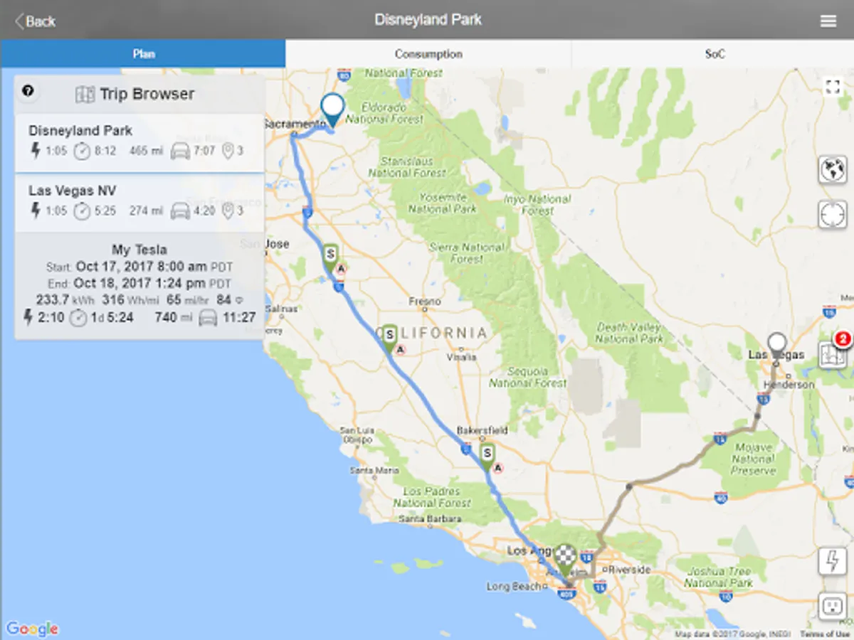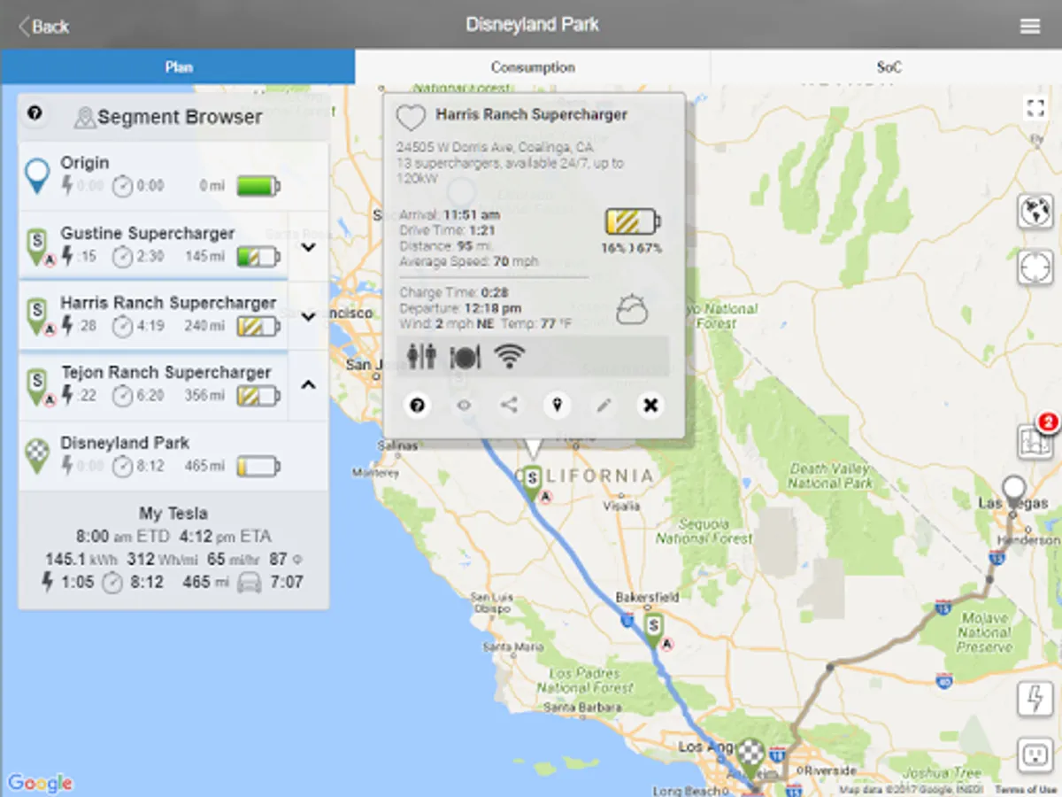 The application takes into account your car's characteristics such as model, battery, charger, wheels, motors and tires along with your driving style. During planning the application collects enroute weather, determines elevation gains/losses, uses wind speeds, temperatures, estimated speed, charging capabilities and your state of charge to help you discover the optimal trip with the least amount of total time expended.