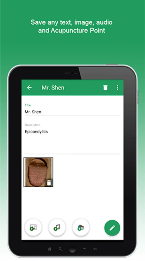 Whether taking notes on patients, treatment ideas, to do lists, images for tongue diagnostics, audio or results of your point searches – MyDatabase in the Shen Acupuncture app stores everything.