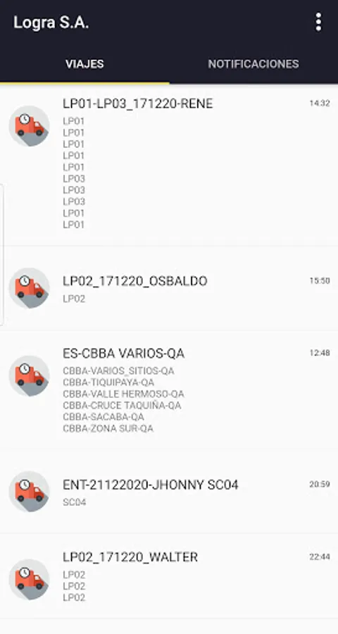 Mobile application for logistics and cargo distribution. Operations and trips are created from the web application and then assign a trip manager and notify it. The trip manager is responsible for reporting through the mobile app the states (Start of trip, Arrival to site, Start, End and Close of trip) and events (Delays, Frequently asked questions, Extra vehicles, Extra people and Overnight stays) that may occur during the trip, since these events affect the cost of the service. The application has an intuitive and friendly interface, similar to WhatsApp, so that the process of reporting status and events flows smoothly and both those responsible and the client receive notifications of these events of interest in real time, even in offline mode in case that the driver loses the telephone signal on the way. Detailed reports of the trip are generated plus a photographic report of all the events that have occurred with the exact time and location. The solution places strong emphasis on the organizational objectives of LOGRA S.A. and the needs of the end user.