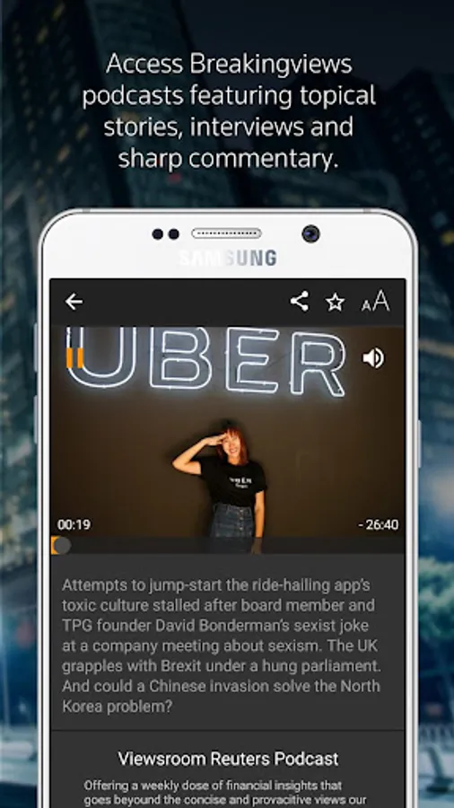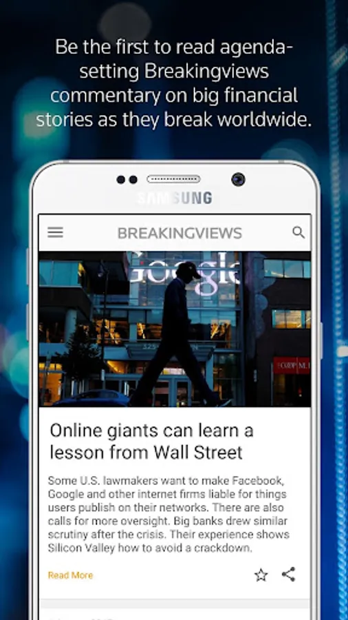 Using the Breakingviews app for the Android, you'll get smart, concise opinions on the latest merger deals, market swings, banking trends, policy choices, regulatory changes and more, plus a summary of the news behind each story and links to source documents, daily videos, and weekly podcasts – all via a clean, easily navigated and searchable interface.