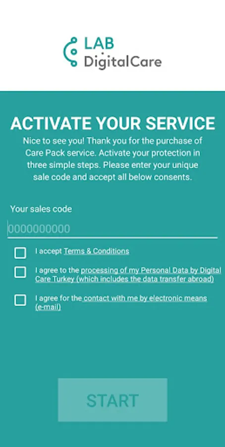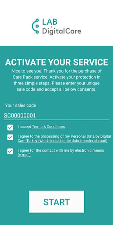 4. Enter your unique sales code, accept consents and activate Care Pack service.