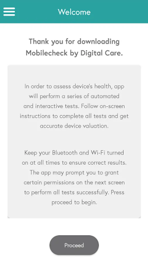 A diagnostic app by Digital Care Group for use in their/partner retail stores. A simple and easy to use tool to receive a real time estimate on the value of your device. The app automatically recognizes make and model of the device, provides a guided process to test all of the main features (Bluetooth, Wi-Fi, LCD, Touchscreen, Speakers, etc.) and offers you the best value for your phone which you can choose to accept or reject. A quick reverification by the retail stores to complete the trade-in before issuing a voucher that can be redeemed at stores.