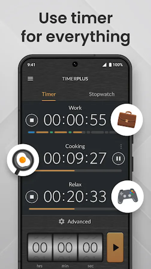 Experience the ultimate time management tool with "Timer Plus with Stopwatch," a comprehensive mobile app designed to revolutionize the way you track and manage time. ⏱️ Digital stopwatch and timer is a simple, easy and accurate app for Android that will help you to measure the time of any situation, like sports, cooking, etc. With the time app, you'll enjoy the freedom of unlimited timers and a feature-packed stopwatch, complete with a lap function and a crystal-clear display. 🆓