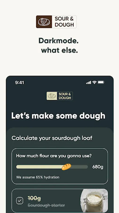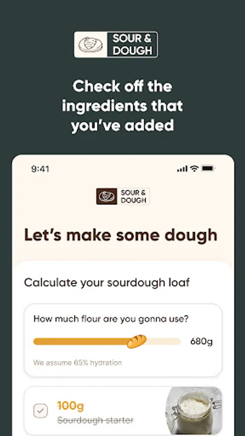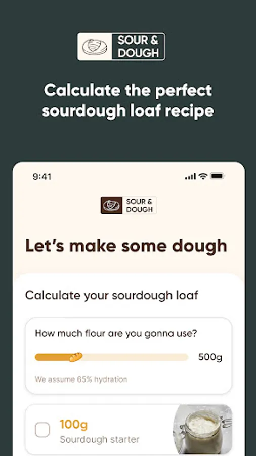 With Sour & Dough, you'll always have the perfect recipe within arm's length. Just give us the amount of wheat flour you want to use, and the app will calculate the rest of the ingredients. Always keeping the baker's percentages in mind.