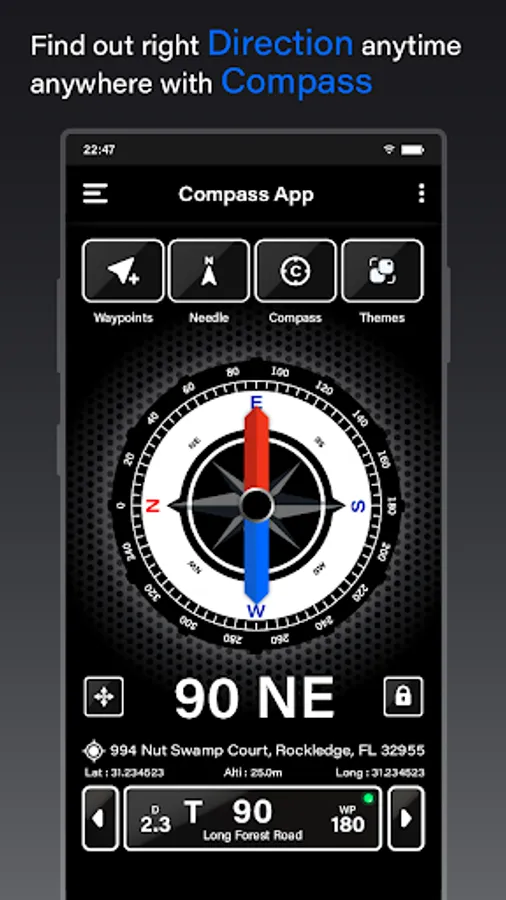 The app Digital Compass Find Direction provides way points for navigation North, South, East, West and also longitude and latitude using accurate GPS location.
