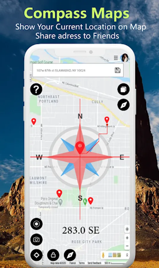 Camera view you can take a screenshot of a place with compass, address.