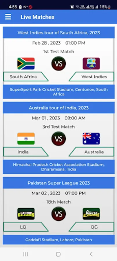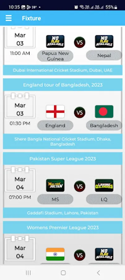 Our Cricket application provides live score updates of every cricket match. Be it a women or men cricket matches or any format i.e. T20, ODI, TEST or any major cricket league being played around the world particularly in India, Pakistan, Bangladesh, Australia, England.